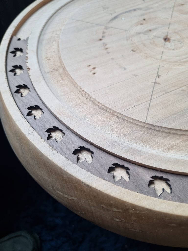 I use Lightburn or Laser GRBL Both are easy to use. Lightburn is my preference. I used the 4mm black walnut slips available from British Hardwoods. Although the machine was big enough to cut a full circle. Because of the size of the slips I set up the machine to cut the circle in 4 sectors. Here’s how I set up the software to cut the inlays. Drawing using Lightburn is very easy.