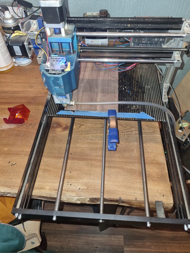 The laser machine is a home made 300 by 500mm laser bed fitted with a 40 watt output blue diode laser. Based on the readily available 3018 chinese laser but with extended X and Y axis. The machine can also take a spindle motor for 3d routing and carving.
